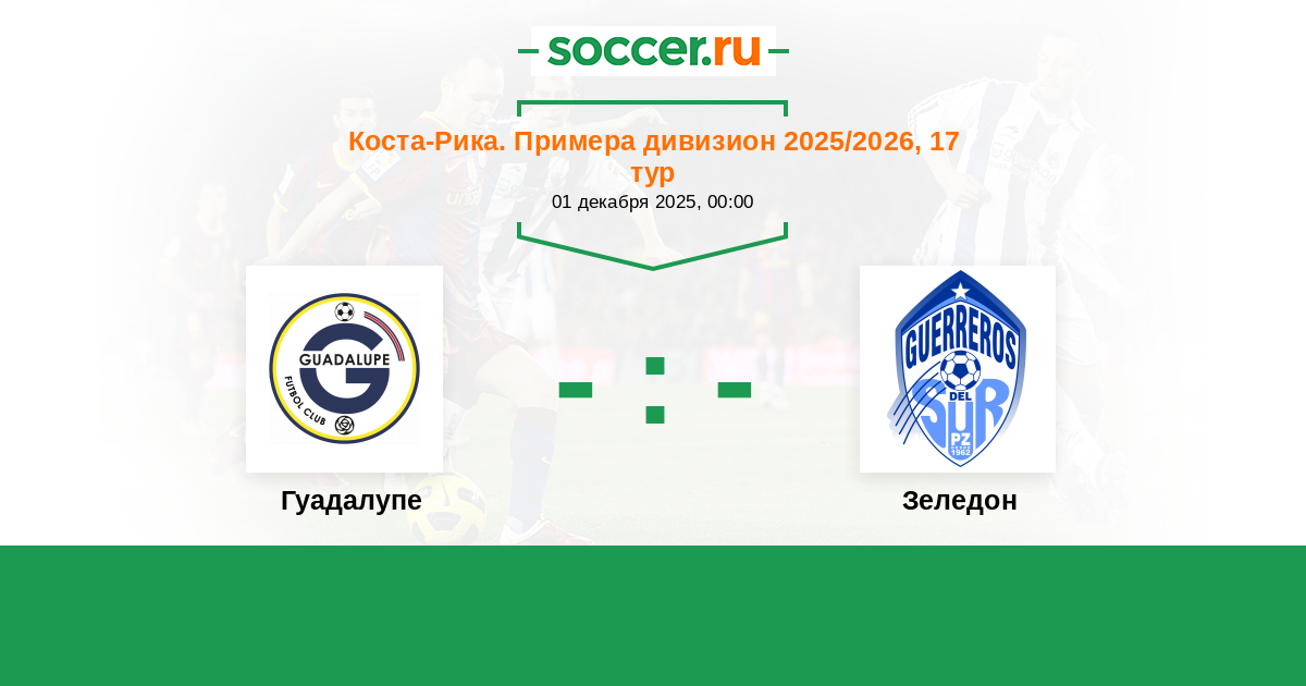 Коста-Рика. Примера дивизион 29.10.2017 Зеледон Логотип футбольный клуб Зеледон (Сан Исидро де Эль Хенерал) 1:1 Логотип футбольный клуб Гуадалупе Гуадалупе