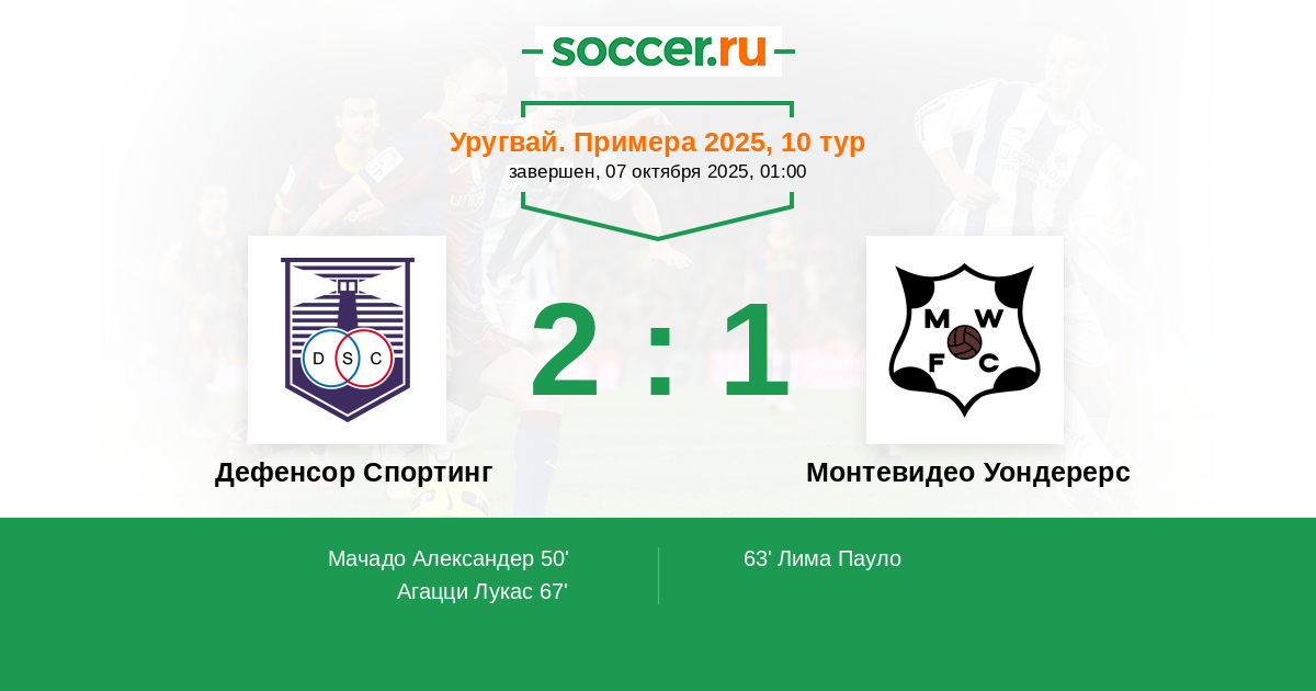Уругвай. Примера A 19.09.2010 Дефенсор Спортинг Логотип футбольный клуб Дефенсор Спортинг (Монтевидео) 1:2 Логотип футбольный клуб Монтевидео Уондерерс Монтевидео Уондерерс
