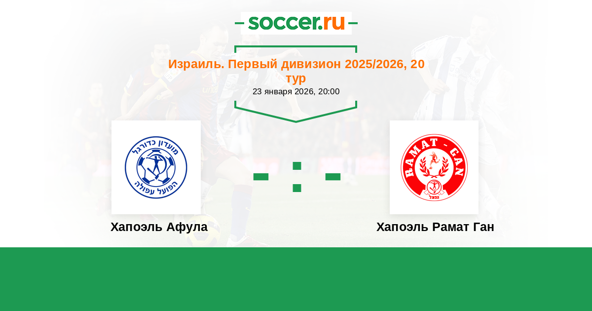 Израиль. Первый дивизион 28.01.2019 Хапоэль Рамат Ган Логотип футбольный клуб Хапоэль Рамат Ган 1:1 Логотип футбольный клуб Хапоэль Афула Хапоэль Афула