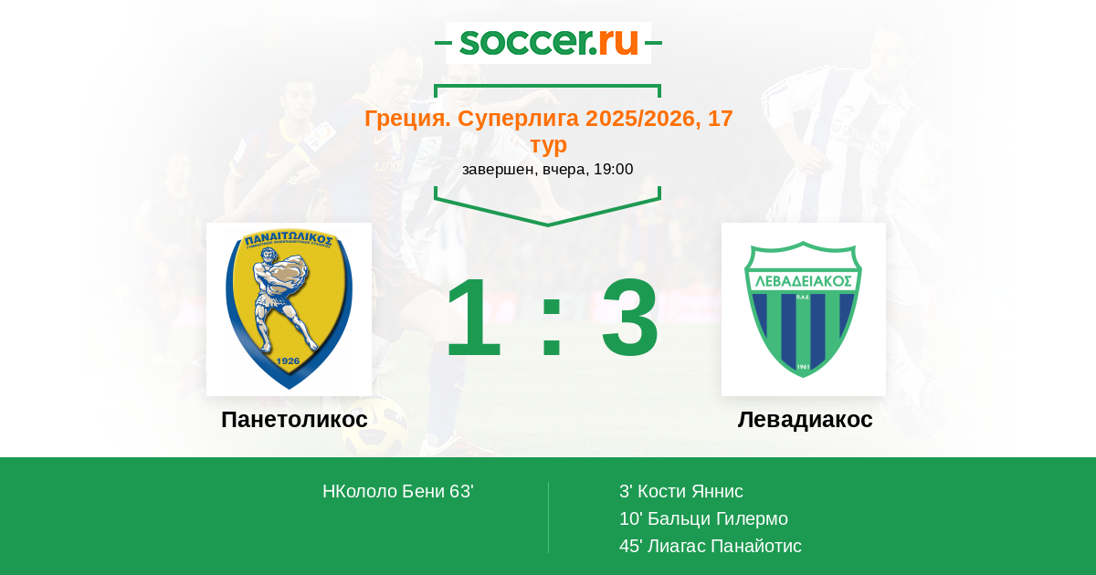 Греция. Суперлига 30.11.2024 Левадиакос Логотип футбольный клуб Левадиакос (Левадия) 1:1 Логотип футбольный клуб Панетоликос (Агринио) Панетоликос