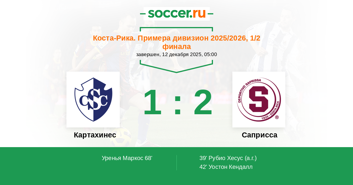 Коста-Рика. Примера дивизион 15.12.2025 Саприсса Логотип футбольный клуб Саприсса (Сан Хосе) 2:1 Логотип футбольный клуб Картахинес (Карфаген) Картахинес