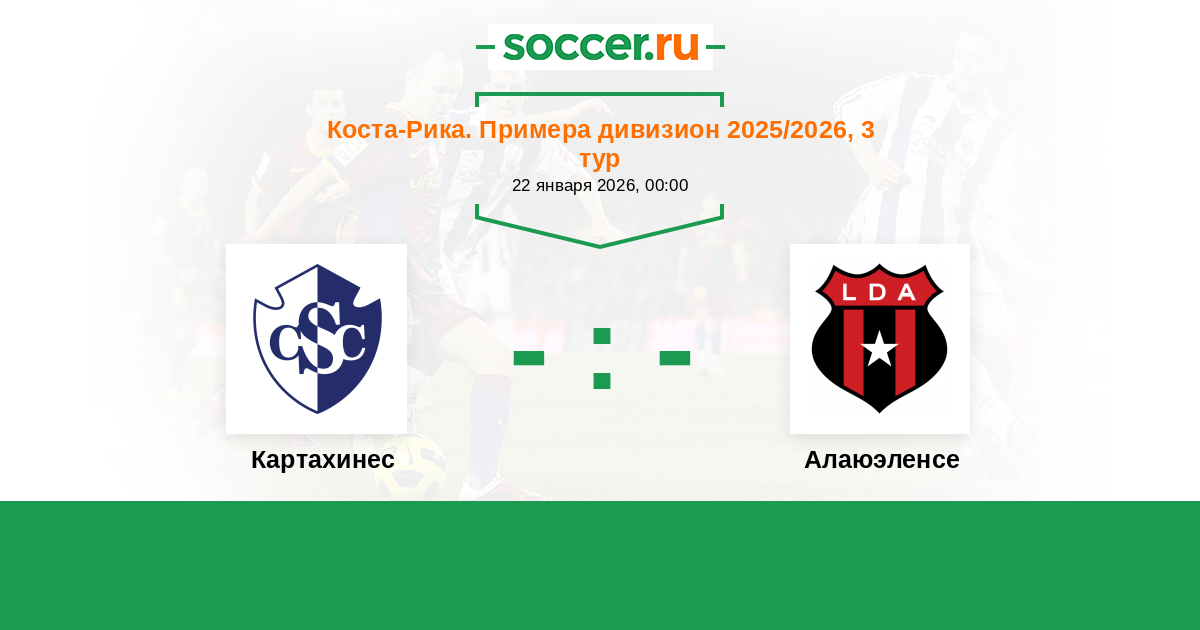 Коста-Рика. Примера дивизион 26.01.2020 Алаюэленсе Логотип футбольный клуб Алаюэленсе (Алаюэла) 1:1 Логотип футбольный клуб Картахинес (Карфаген) Картахинес
