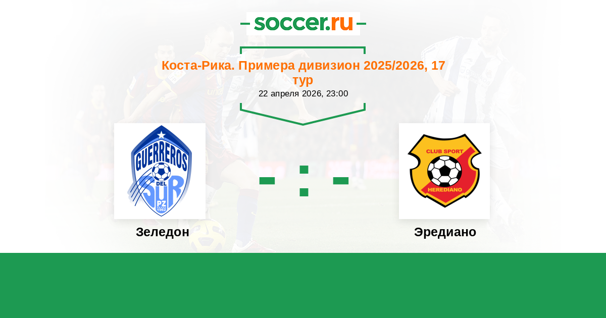 Коста-Рика. Примера дивизион 29.04.2012 Эредиано Логотип футбольный клуб Эредиано 1:1 Логотип футбольный клуб Зеледон (Сан Исидро де Эль Хенерал) Зеледон