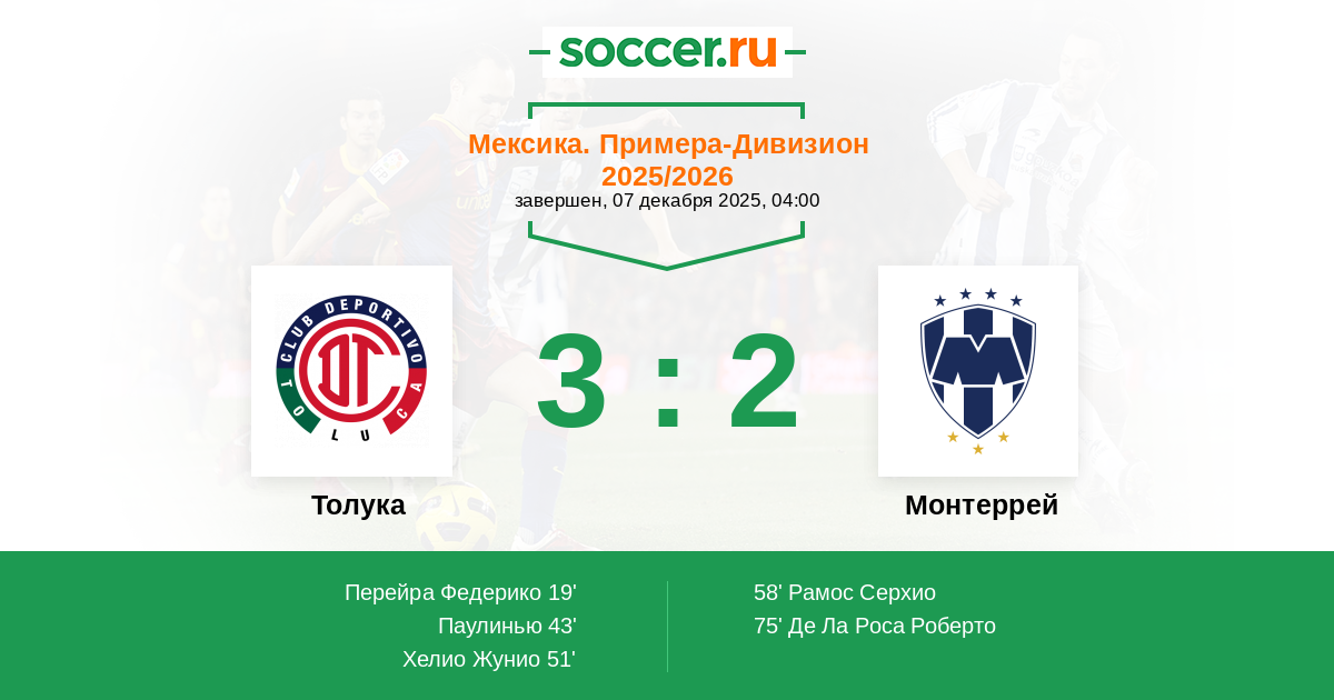 Мексика. Примера-Дивизион 04.12.2025 Монтеррей Логотип футбольный клуб Монтеррей 1:0 Логотип футбольный клуб Толука Толука