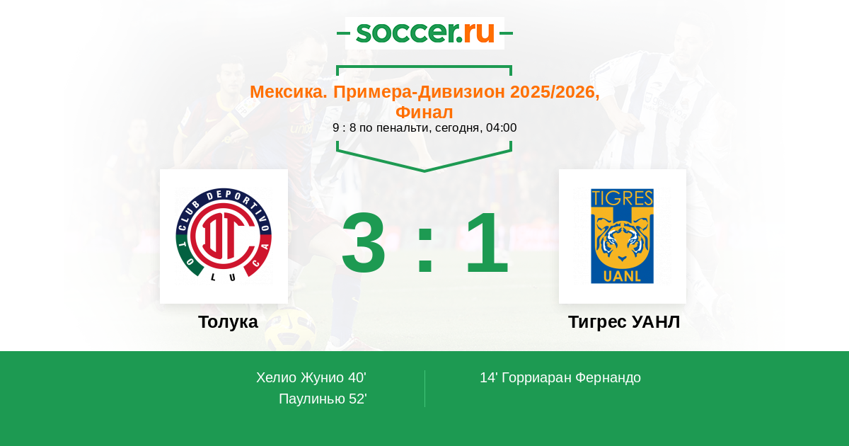 Мексика. Примера-Дивизион 18.05.2025 Толука Логотип футбольный клуб Толука 3:0 Логотип футбольный клуб Тигрес УАНЛ (Монтеррей) Тигрес УАНЛ