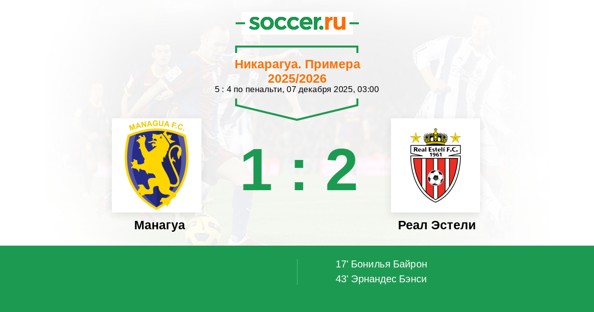 Никарагуа. Примера 23.10.2025 Манагуа Логотип футбольный клуб Манагуа 2:1 Логотип футбольный клуб Реал Эстели Реал Эстели