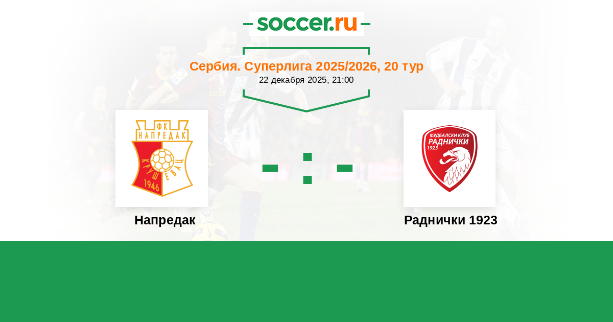 Сербия. Суперлига 27.11.2021 Раднички 1923 Логотип футбольный клуб Раднички 1923 (Крагуевац) 1:2 Логотип футбольный клуб Напредак (Крушевац) Напредак