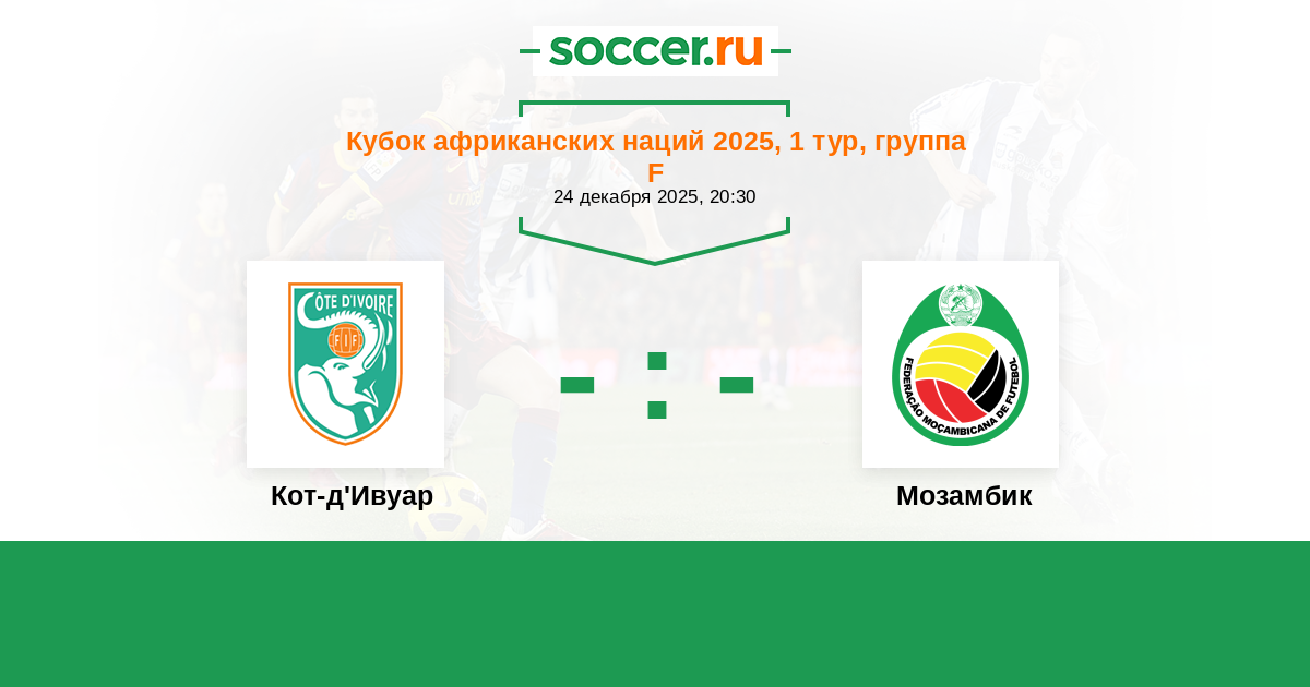 Кот Дивуар приехал на КАН в хорошей форме и для старта в турнире им выпал удобный соперник . За 6 личек , которые были в истории между Кот Дивуаром и Мозамбиком, всего в одном матче Мозамбик смог хотя бы забить гол . П 1