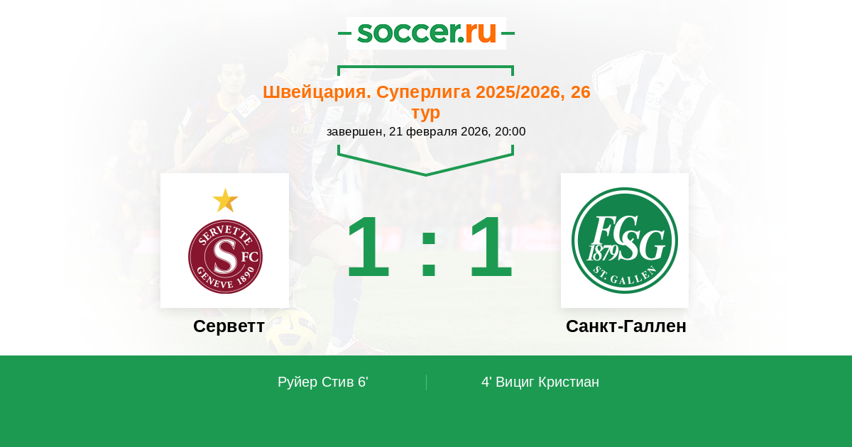 Швейцария. Суперлига 10.02.2021 Серветт Логотип футбольный клуб Серветт (Женева) 2:2 Логотип футбольный клуб Санкт-Галлен Санкт-Галлен