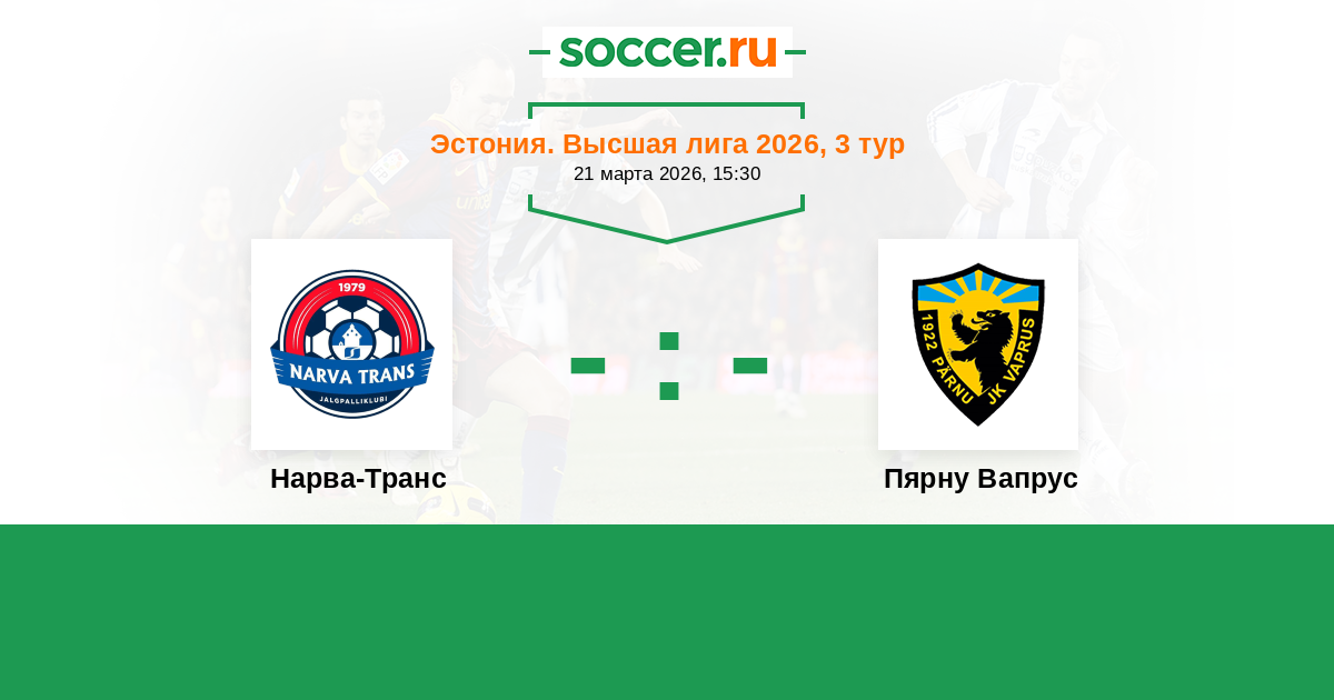 Эстония. Высшая лига 20.03.2021 Нарва-Транс Логотип футбольный клуб Нарва-Транс 1:1 Логотип футбольный клуб Пярну Вапрус Пярну Вапрус
