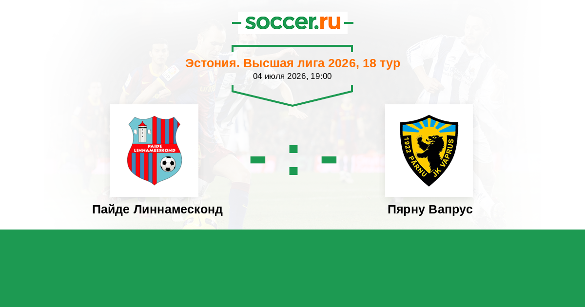 Эстония. Высшая лига 18.08.2024 Пайде Линнамесконд Логотип футбольный клуб Пайде Линнамесконд 1:0 Логотип футбольный клуб Пярну Вапрус Пярну Вапрус