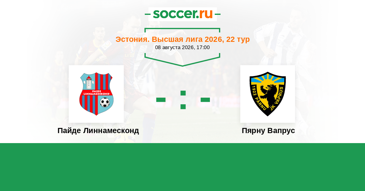 Эстония. Высшая лига 18.08.2024 Пайде Линнамесконд Логотип футбольный клуб Пайде Линнамесконд 1:0 Логотип футбольный клуб Пярну Вапрус Пярну Вапрус