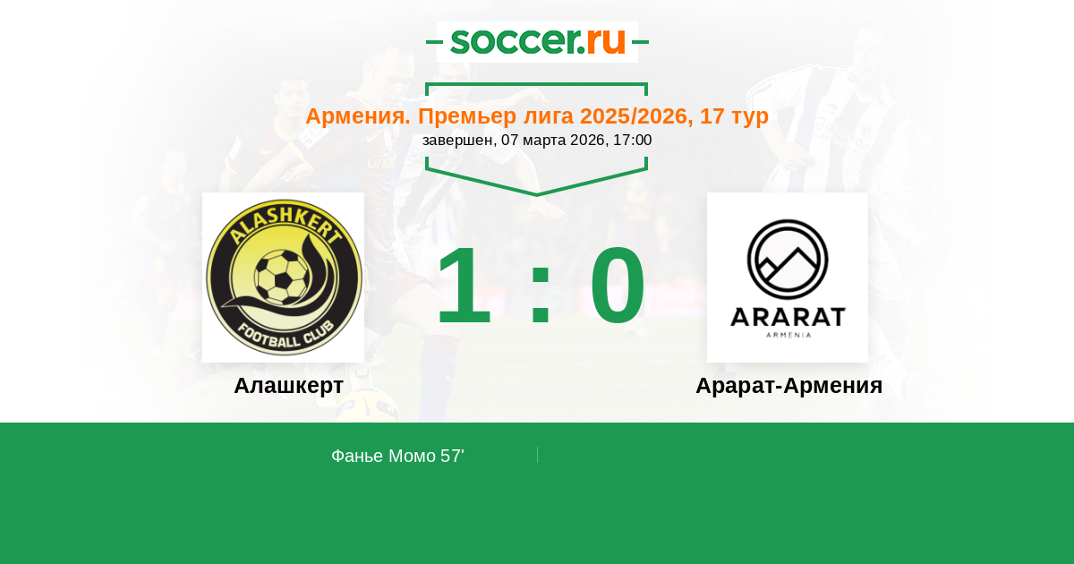 Армения. Премьер-лига 06.04.2026 Арарат-Армения Логотип футбольный клуб Арарат-Армения (Ереван) 1:1 Логотип футбольный клуб Алашкерт (Мартуни) Алашкерт