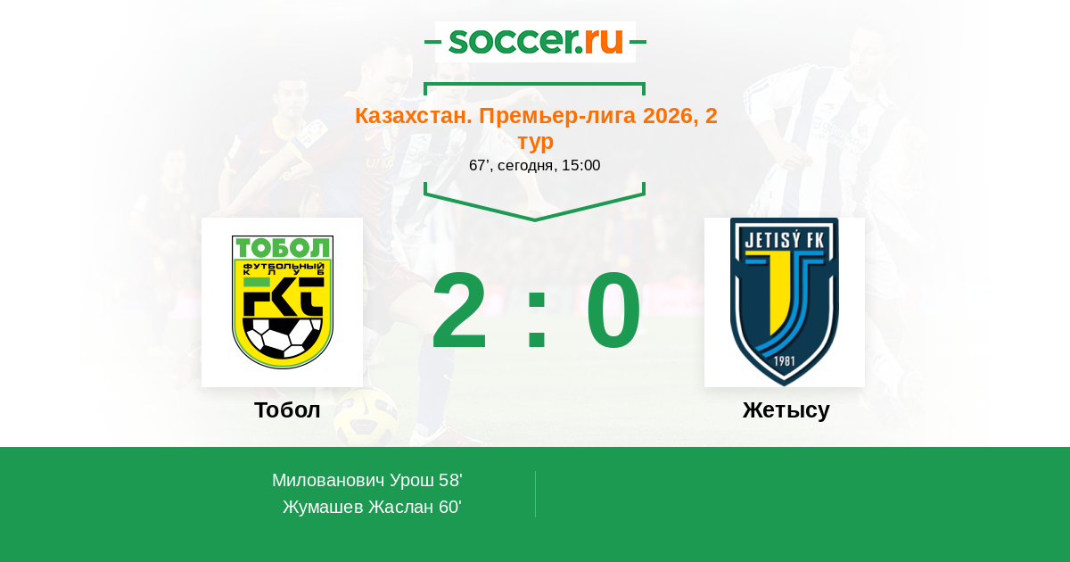 Казахстан. Премьер-лига 21.06.2025 Тобол Логотип футбольный клуб Тобол (Костанай) 2:1 Логотип футбольный клуб Жетысу (Талдыкорган) Жетысу