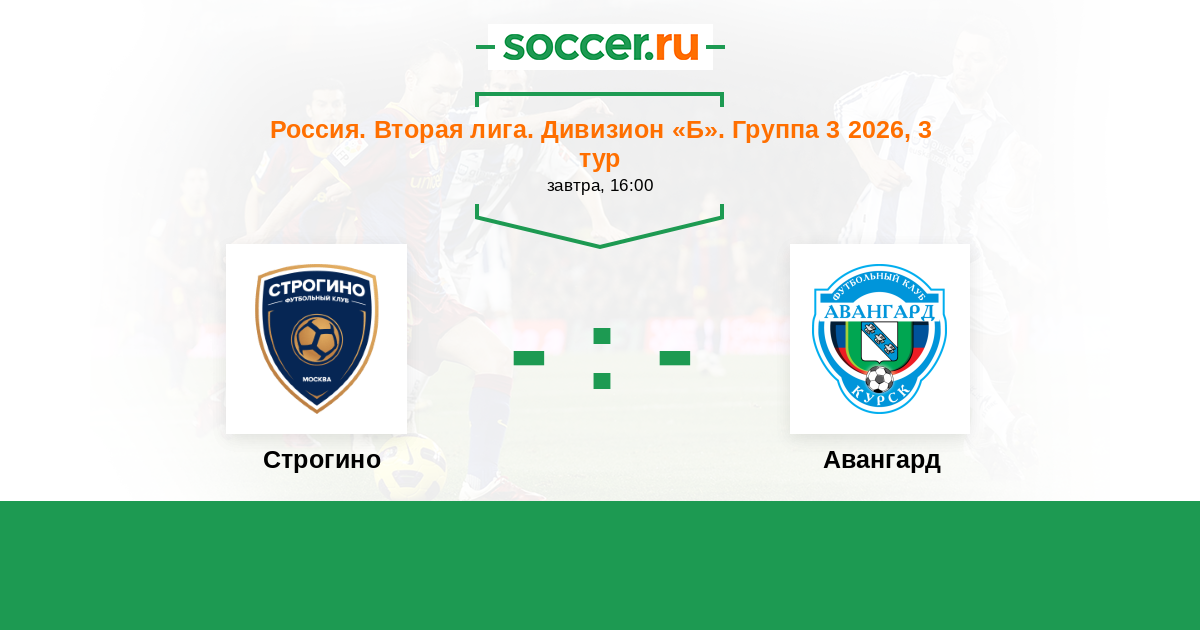 Россия. Вторая лига. Группа 3 09.04.2022 Авангард Логотип футбольный клуб Авангард (Курск) 0:3 Логотип футбольный клуб Строгино (Москва) Строгино