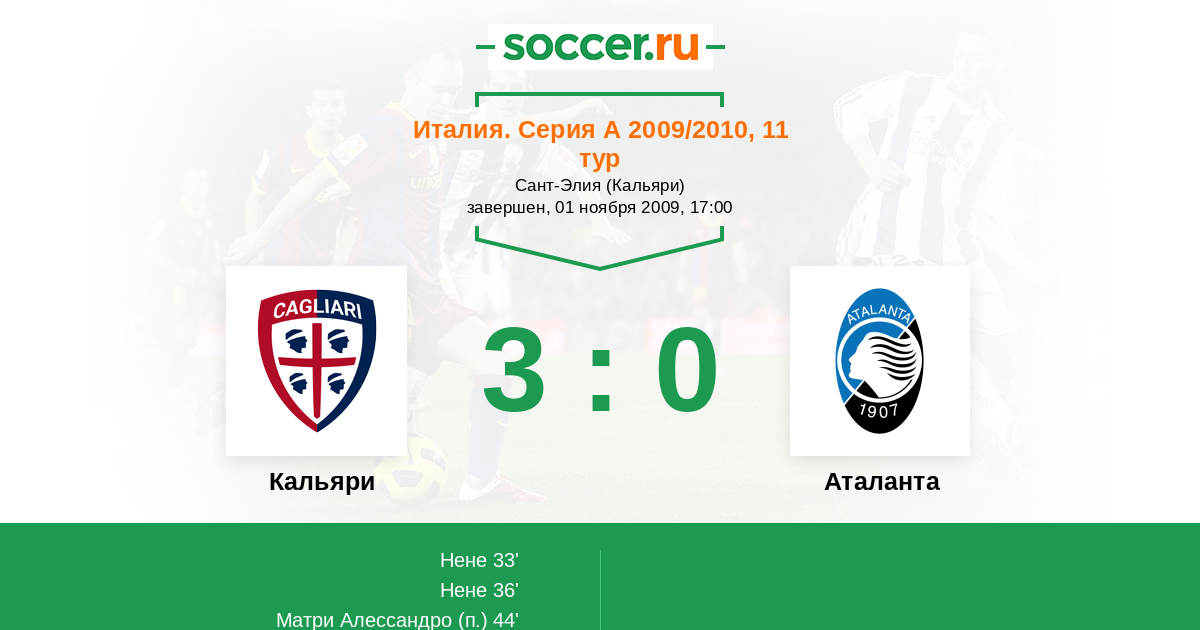 Италия. Серия А 06.11.2011 Аталанта Логотип футбольный клуб Аталанта (Бергамо) 1:0 Логотип футбольный клуб Кальяри Кальяри