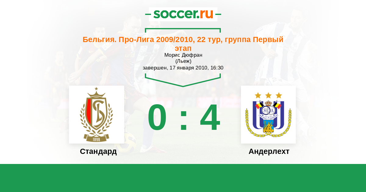 Бельгия. Про-Лига 30.08.2009 Андерлехт Логотип футбольный клуб Андерлехт (Брюссель) 1:1 Логотип футбольный клуб Стандард (Льеж) Стандард