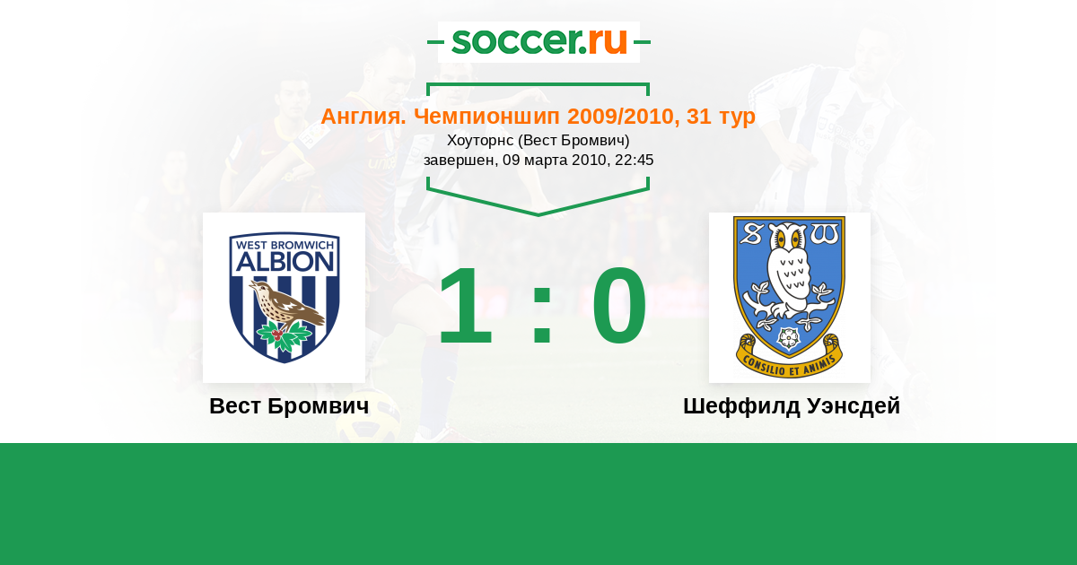 Англия. Чемпионшип 28.11.2009 Шеффилд Уэнсдей Логотип футбольный клуб Шеффилд Уэнсдей 0:4 Логотип футбольный клуб Вест Бромвич Вест Бромвич