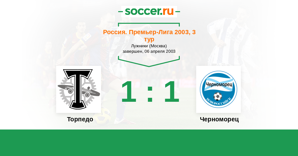 Россия. Премьер-Лига 19.10.2003 Черноморец Логотип футбольный клуб Черноморец (Новороссийск) 2:4 Логотип футбольный клуб Торпедо (Москва) Торпедо