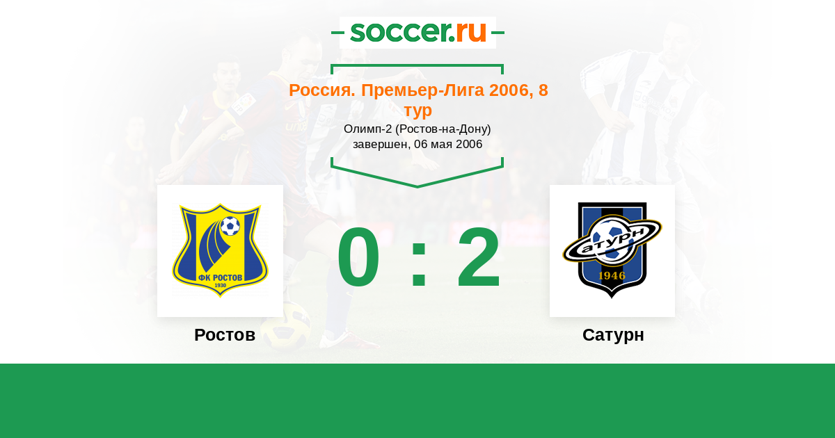 Россия. Премьер-Лига 21.10.2006 Сатурн Логотип футбольный клуб Сатурн (Раменское) 0:0 Логотип футбольный клуб Ростов (Ростов-на-Дону) Ростов