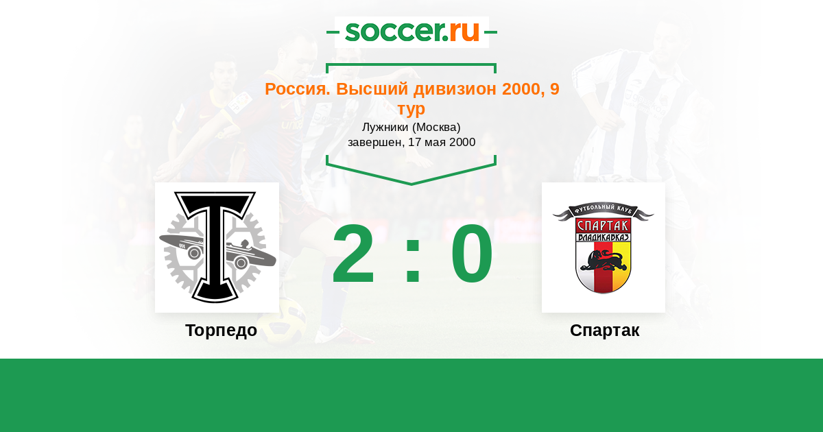 Россия. Премьер-Лига 27.08.2000 Спартак Логотип футбольный клуб Спартак (Владикавказ) 2:1 Логотип футбольный клуб Торпедо (Москва) Торпедо