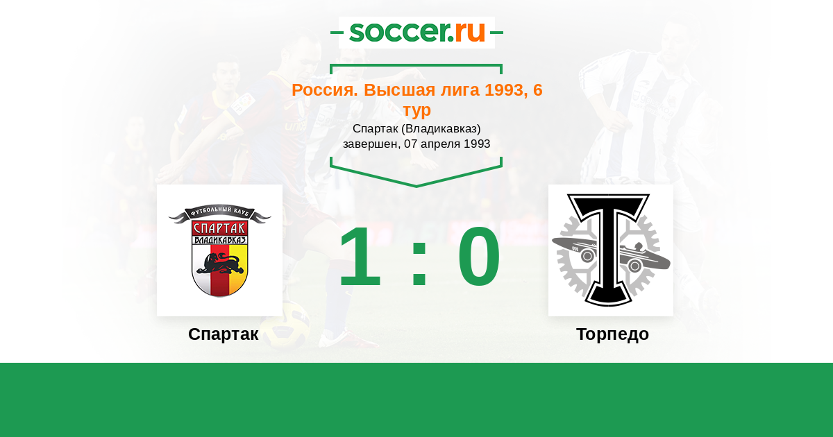 Россия. Премьер-Лига 24.07.1993 Торпедо Логотип футбольный клуб Торпедо (Москва) 2:0 Логотип футбольный клуб Спартак (Владикавказ) Спартак