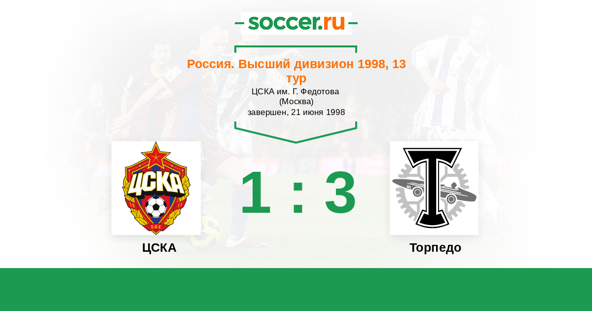 Россия. Премьер-Лига 17.10.1998 Торпедо Логотип футбольный клуб Торпедо (Москва) 0:2 Логотип футбольный клуб ЦСКА (Москва) ЦСКА