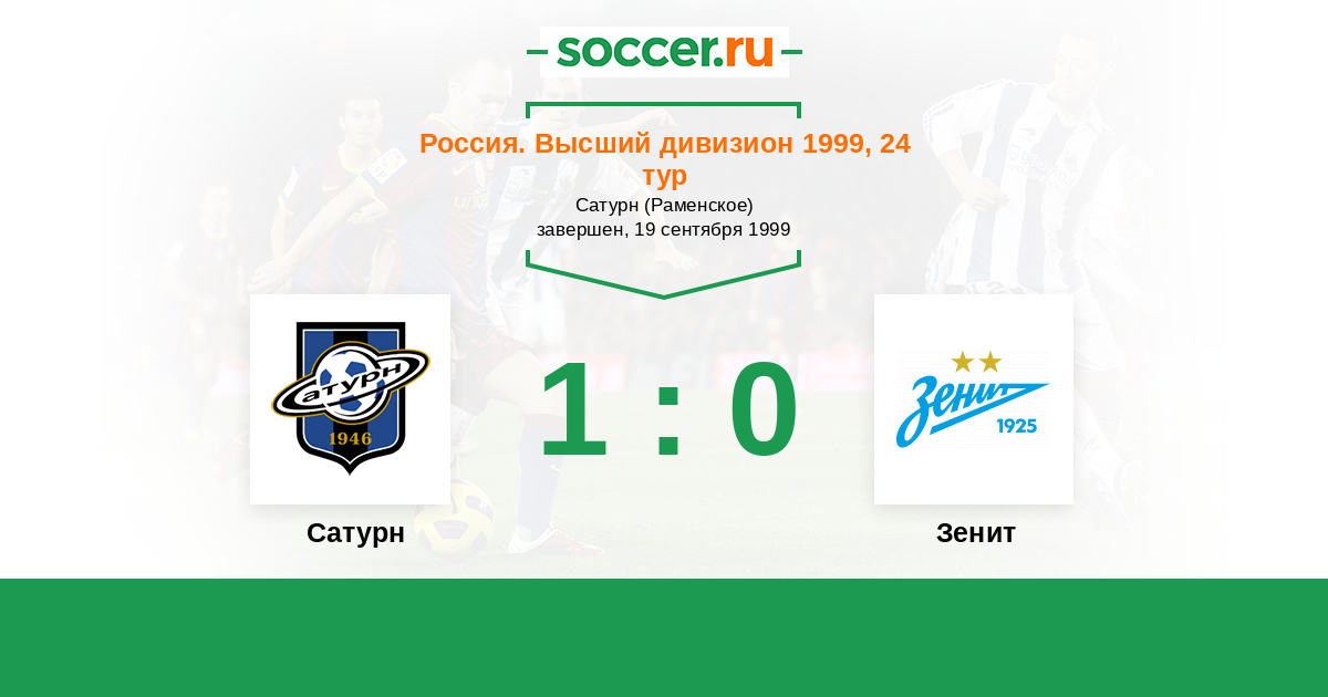 Россия. Премьер-Лига 13.06.1999 Зенит Логотип футбольный клуб Зенит (Санкт-Петербург) 2:1 Логотип футбольный клуб Сатурн (Раменское) Сатурн