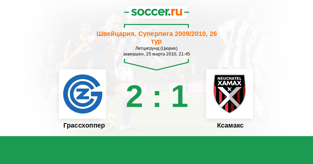 Швейцария. Суперлига 10.04.2010 Ксамакс Логотип футбольный клуб Ксамакс (Невшатель) 0:1 Логотип футбольный клуб Грассхоппер (Цюрих) Грассхоппер