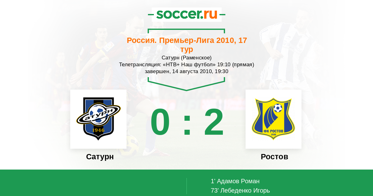 Россия. Премьер-Лига 28.03.2010 Ростов Логотип футбольный клуб Ростов (Ростов-на-Дону) 1:0 Логотип футбольный клуб Сатурн (Раменское) Сатурн