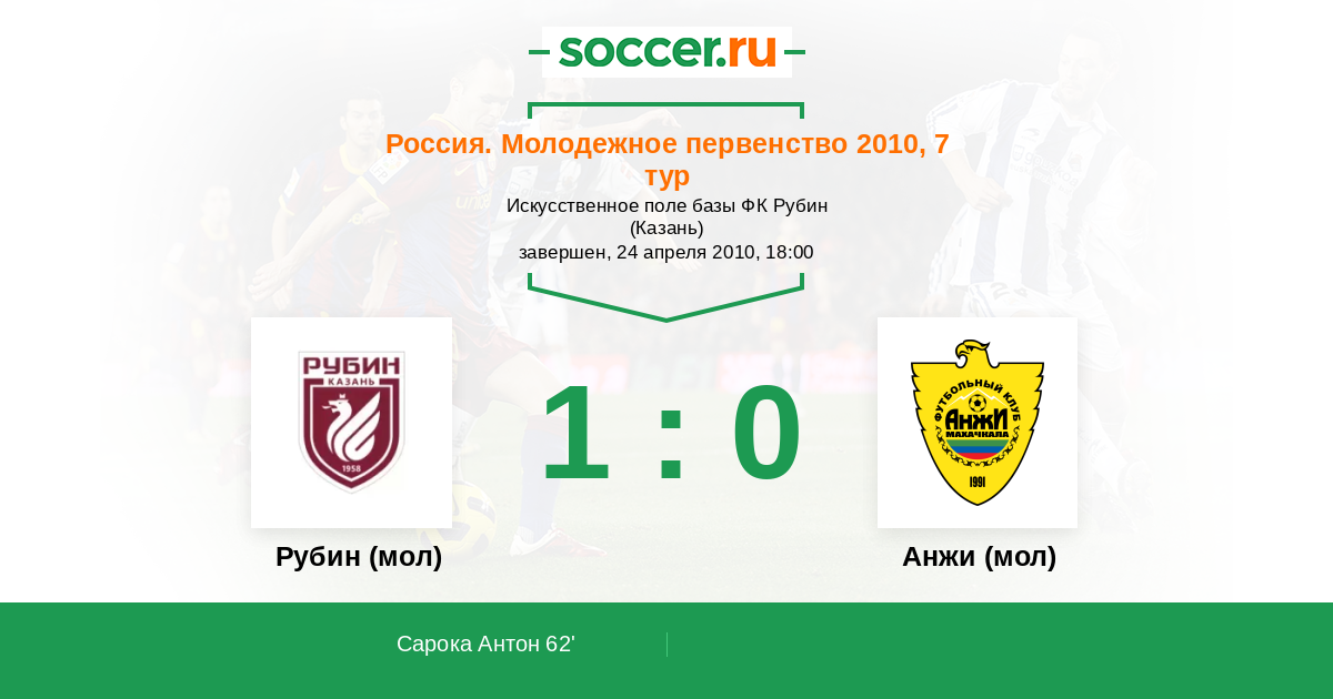Россия. Премьер-Лига U21 18.09.2010 Анжи (мол) Логотип футбольный клуб Анжи (мол) (Махачкала) 1:2 Логотип футбольный клуб Рубин (мол) (Казань) Рубин (мол)