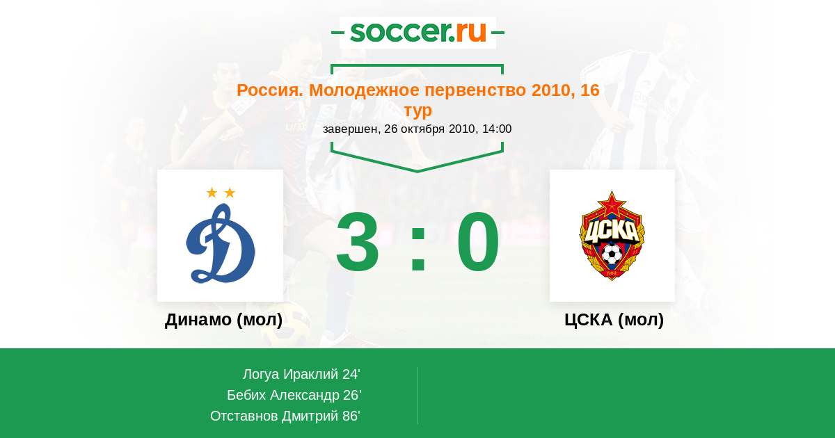 Россия. Премьер-Лига U21 20.03.2010 ЦСКА (мол) Логотип футбольный клуб ЦСКА (мол) (Москва) 0:3 Логотип футбольный клуб Динамо (мол) (Москва) Динамо (мол)