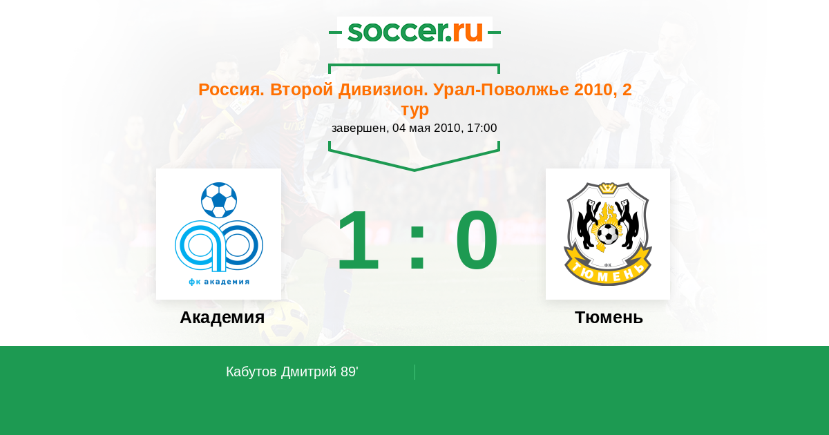 Россия. Вторая лига. Группа 4 10.08.2010 Тюмень Логотип футбольный клуб Тюмень 2:2 Логотип футбольный клуб Академия (Тольятти) Академия