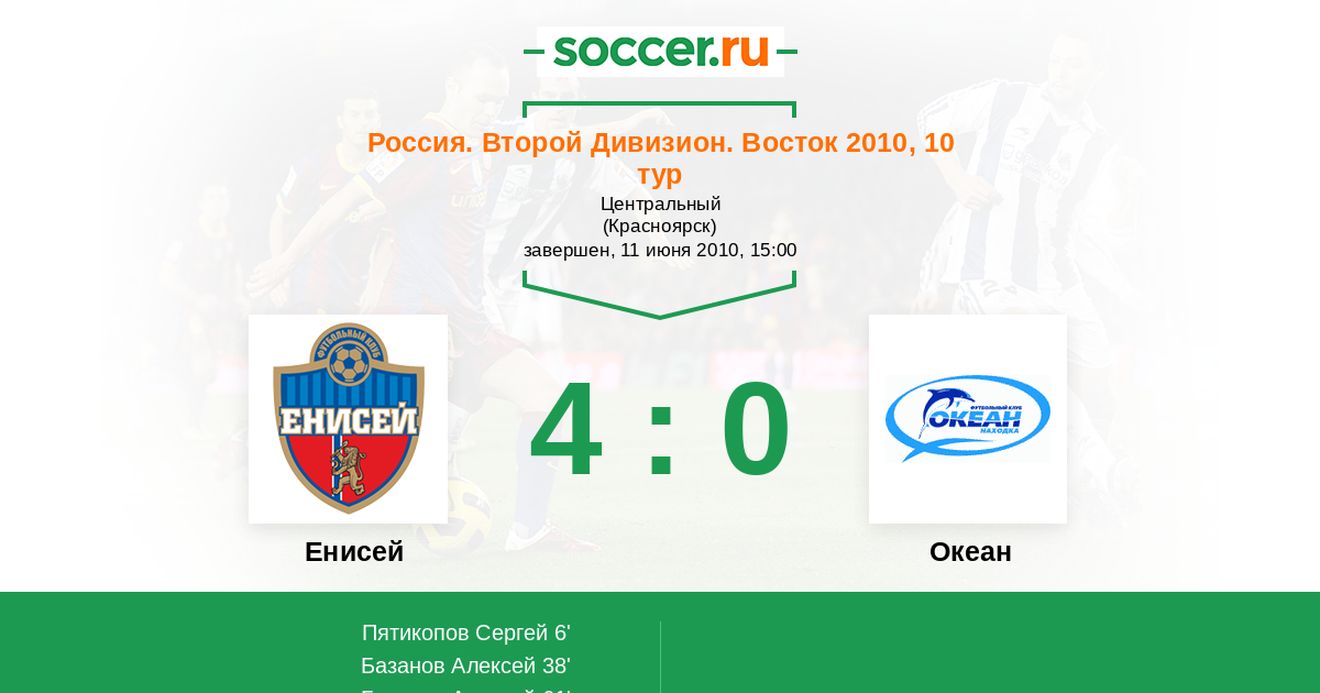 Россия. 2-й дивизион. Восток 08.08.2010 Океан Логотип футбольный клуб Океан (Находка) 1:1 Логотип футбольный клуб Енисей (Красноярск) Енисей