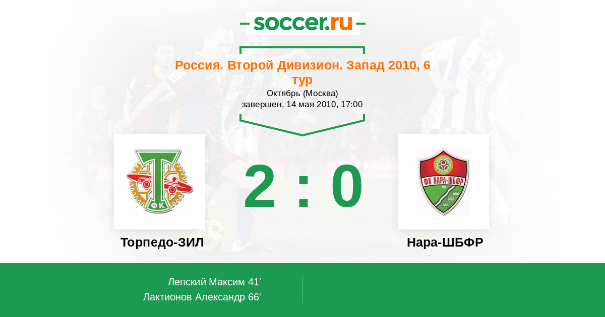 Россия. Вторая лига. Группа 2 17.08.2010 Нара-ШБФР Логотип футбольный клуб Нара-ШБФР (Наро-Фоминск) 1:2 Логотип футбольный клуб Торпедо-ЗИЛ (Москва) Торпедо-ЗИЛ