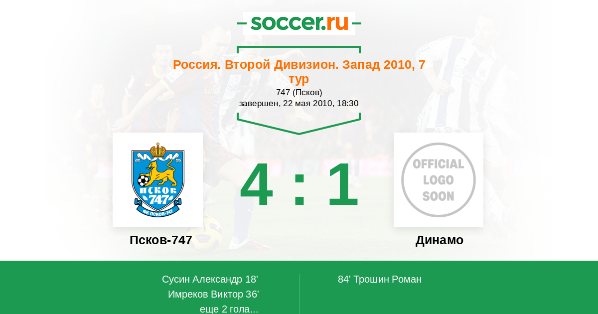 Россия. Вторая лига. Группа 2 25.08.2010 Динамо Логотип футбольный клуб Динамо (Кострома) 1:2 Логотип футбольный клуб Псков-747 Псков-747