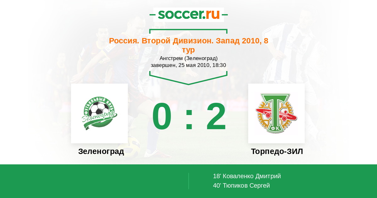 Россия. Вторая лига. Группа 2 28.08.2010 Торпедо-ЗИЛ Логотип футбольный клуб Торпедо-ЗИЛ (Москва) 1:1 Логотип футбольный клуб Зеленоград (Москва) Зеленоград
