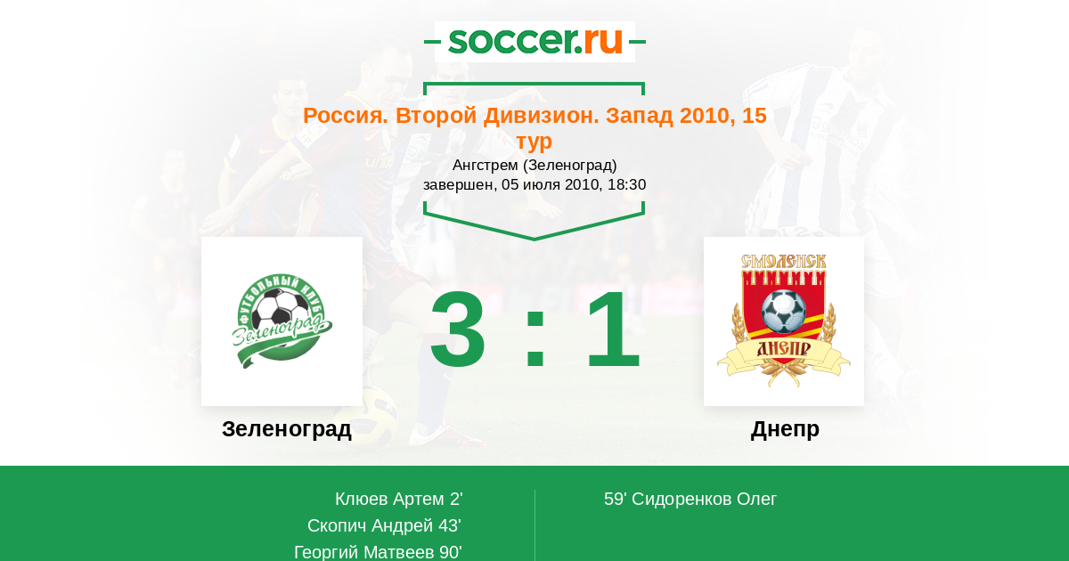 Россия. Вторая лига. Группа 2 07.10.2010 Днепр Логотип футбольный клуб Днепр (Смоленск) 2:4 Логотип футбольный клуб Зеленоград (Москва) Зеленоград