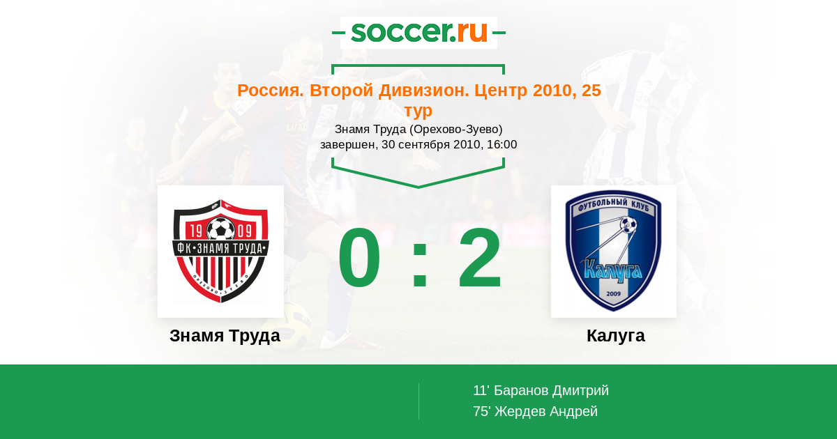 Россия. Вторая лига. Группа 3 29.06.2010 Калуга Логотип футбольный клуб Калуга 0:0 Логотип футбольный клуб Знамя Труда (Орехово-Зуево) Знамя Труда