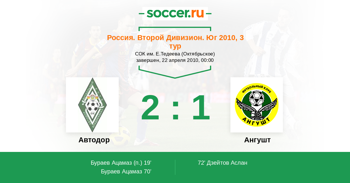 Россия. Вторая лига. Группа 1 08.08.2010 Ангушт Логотип футбольный клуб Ангушт (Назрань) 0:0 Логотип футбольный клуб Автодор (Владикавказ) Автодор