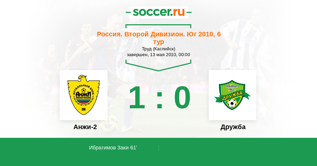 Россия. Вторая лига. Группа 1 16.05.2018 Дружба Логотип футбольный клуб Дружба (Майкоп) 1:1 Логотип футбольный клуб Анжи-2 (Махачкала) Анжи-2