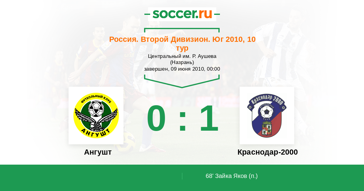 Россия. Вторая лига. Группа 1 05.06.2009 Краснодар-2000 Логотип футбольный клуб Краснодар-2000 1:0 Логотип футбольный клуб Ангушт (Назрань) Ангушт