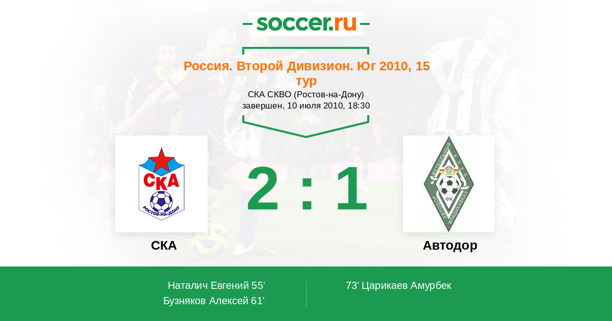 Россия. Вторая лига. Группа 1 18.10.2010 Автодор Логотип футбольный клуб Автодор (Владикавказ) 0:1 Логотип футбольный клуб СКА (Ростов-на-Дону) СКА