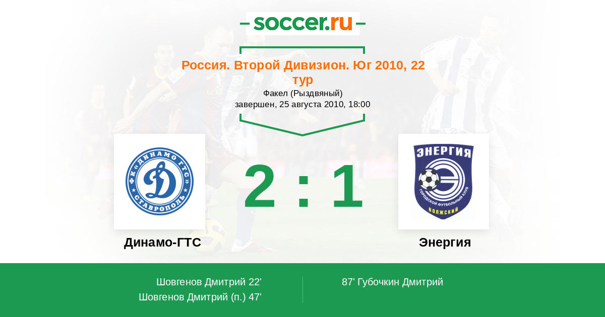 Россия. Вторая лига. Группа 1 30.09.2009 Кавказтрансгаз-2005 Логотип футбольный клуб Кавказтрансгаз-2005 (Ставрополь) 2:1 Логотип футбольный клуб Энергия (Волжский) Энергия