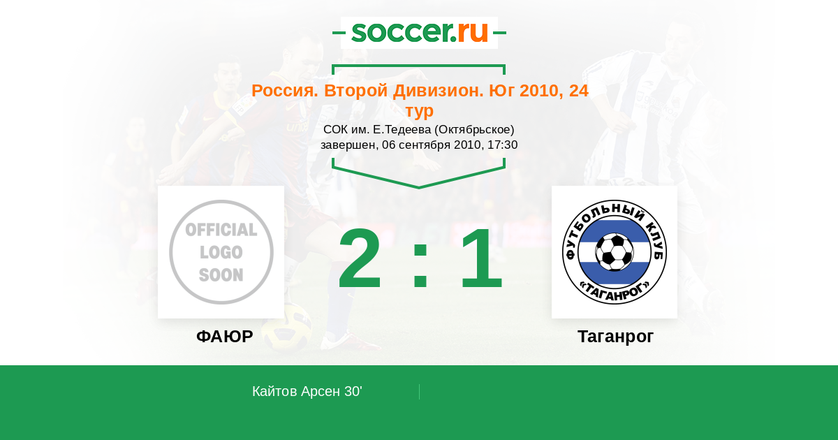Россия. Вторая лига. Группа 1 26.05.2010 Таганрог Логотип футбольный клуб Таганрог 1:0 Логотип футбольный клуб ФАЮР (Беслан) ФАЮР