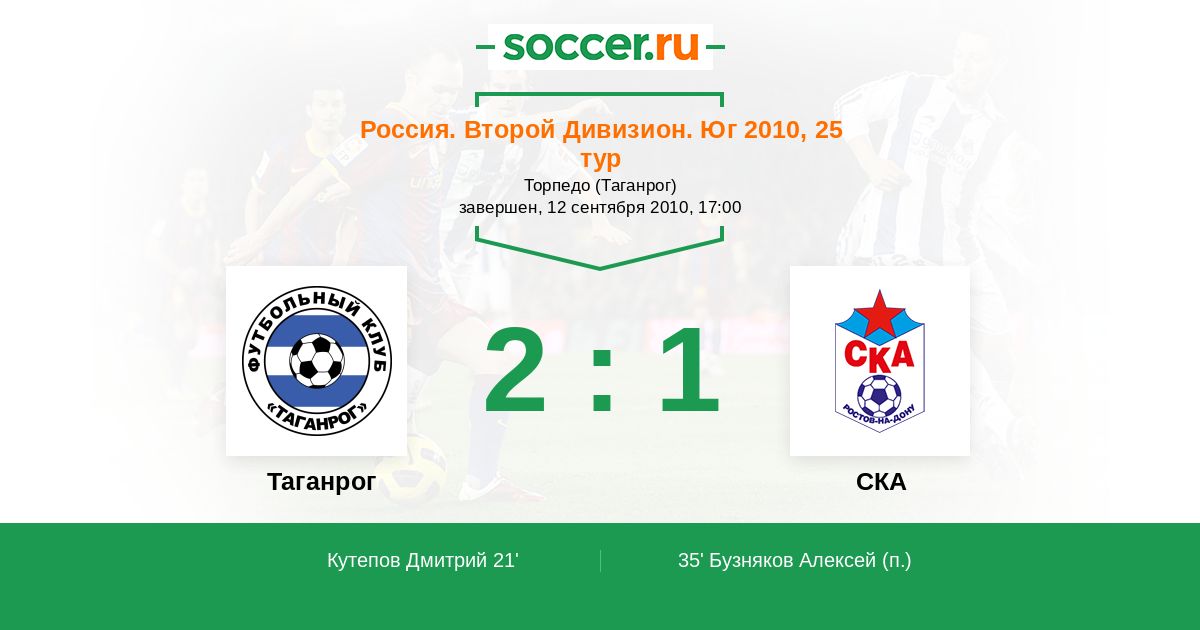 Россия. Вторая лига. Группа 1 01.06.2010 СКА Логотип футбольный клуб СКА (Ростов-на-Дону) 2:0 Логотип футбольный клуб Таганрог Таганрог