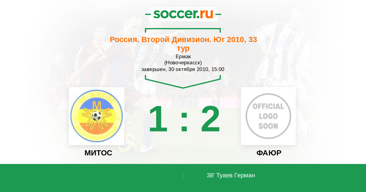 Россия. Вторая лига. Группа 1 22.07.2010 ФАЮР Логотип футбольный клуб ФАЮР (Беслан) 1:1 Логотип футбольный клуб МИТОС (Новочеркасск) МИТОС