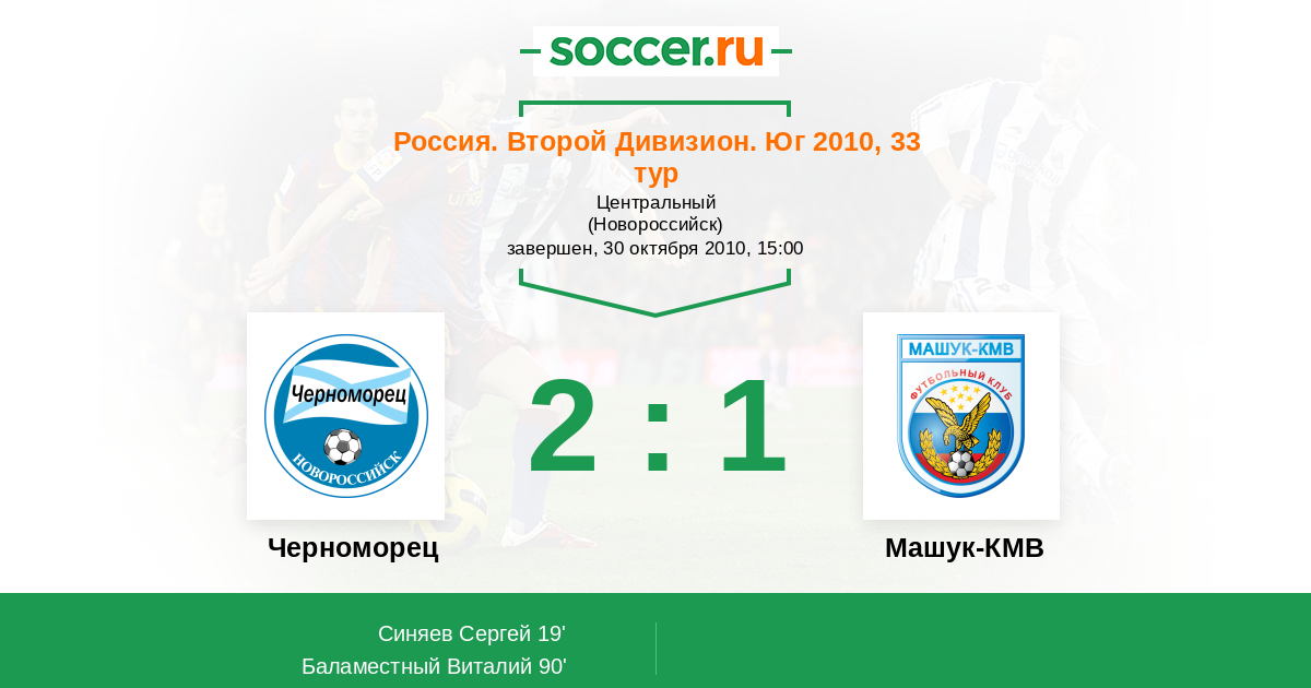 Россия. Вторая лига. Группа 1 22.07.2010 Машук-КМВ Логотип футбольный клуб Машук-КМВ (Пятигорск) 2:1 Логотип футбольный клуб Черноморец (Новороссийск) Черноморец