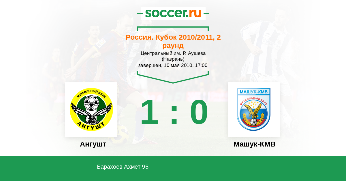 Россия. Вторая лига. Группа 1 15.06.2010 Машук-КМВ Логотип футбольный клуб Машук-КМВ (Пятигорск) 5:0 Логотип футбольный клуб Ангушт (Назрань) Ангушт