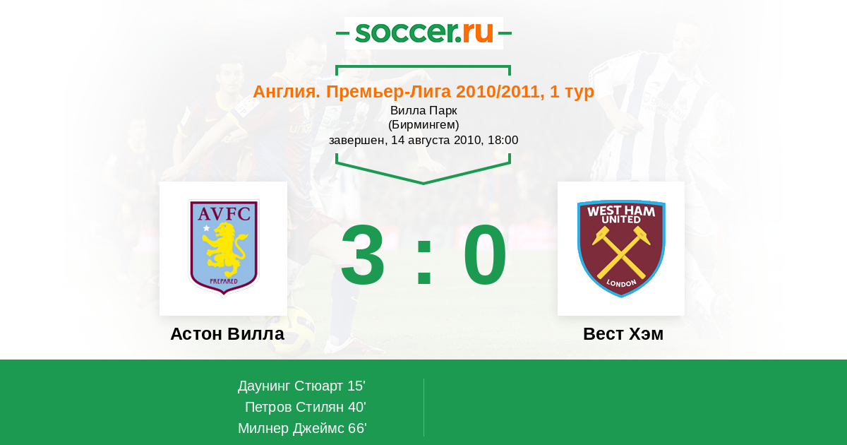 Англия. Премьер-Лига 16.04.2011 Вест Хэм Логотип футбольный клуб Вест Хэм (Лондон) 1:2 Логотип футбольный клуб Астон Вилла (Бирмингем) Астон Вилла